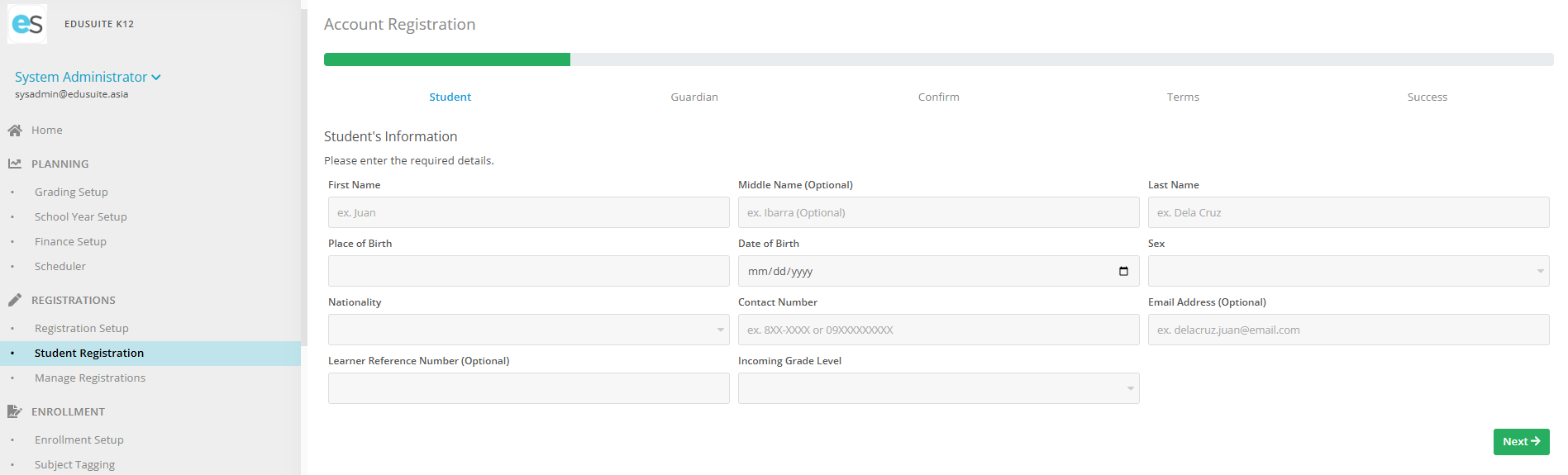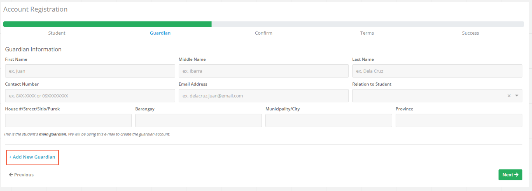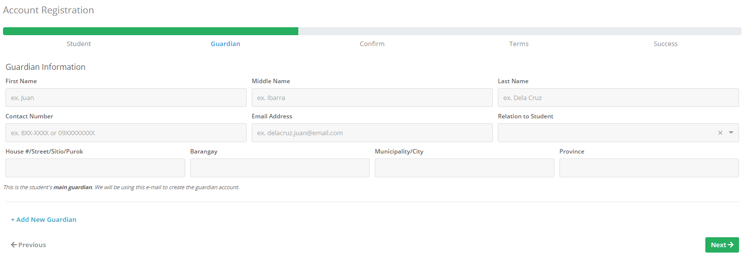 * Review the inputted details for the Student and Guardian/s. Once reviewed, click **Next**